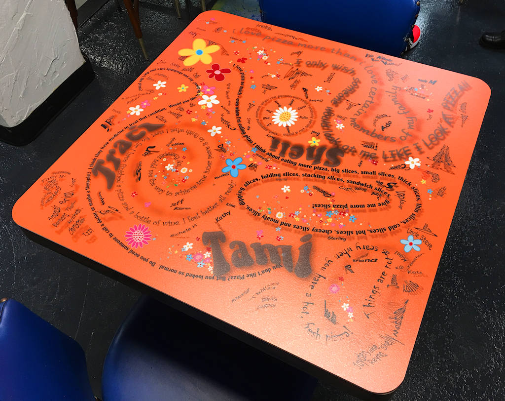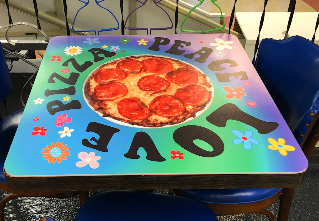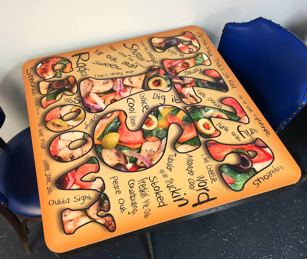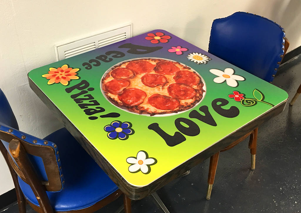 The restaurant location used to be an ice cream parlor in the 1940’s, located in an old Border Dairy plant on the historic Broadway Boulevard. The build out and much of the interior equipment and tables were donated by the building owner. One of the first challenges we faced was how to cover the dated wood laminated table tops with new, vibrant graphics that supported the owners’ vision. Since nothing existed to accomplish this specific task, we designed the new table tops ourselves. After testing various iterations, we opted to use custom shaped, opaque white polycarbonate panels with digitally printed custom graphics, and top them with durable laminate usually reserved for preserving floor vinyl graphics. The result produced one-of-a-kind durable table tops that conveyed the Sisters’ messages with humor, beauty and creative design. A few of the table tops are featured in the following images.