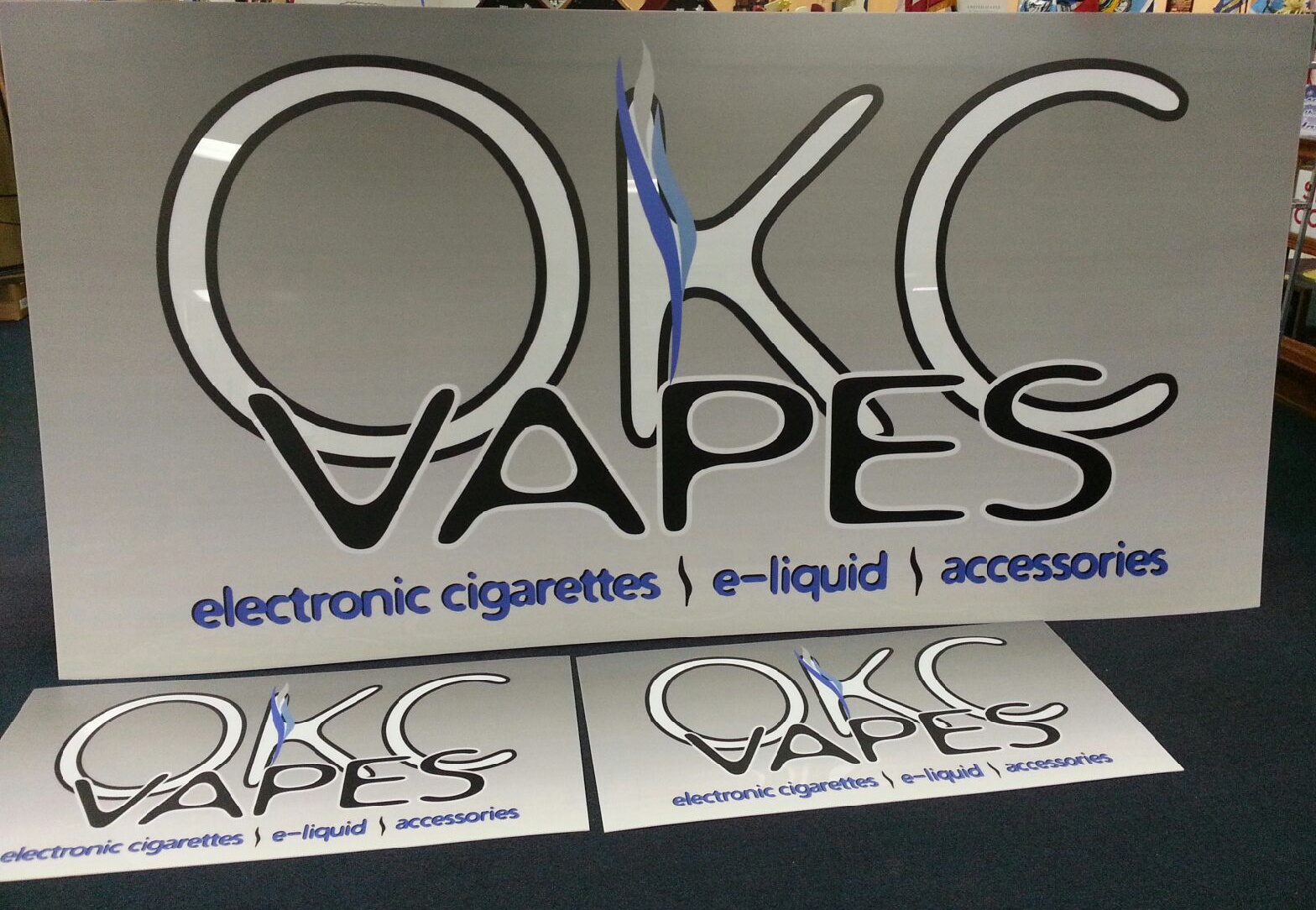 The OKC Vapes logo has gone a long way since we first designed it last year. After multiple banners, sign faces and illuminated logo signs, we added a gradient background to make this one stand out in Norman. Digital printing has come a long way. This 5′ x 10′ piece was printed on .040 lexan, and will slide into an LED cabinet already mounted above the Norman store entrance.