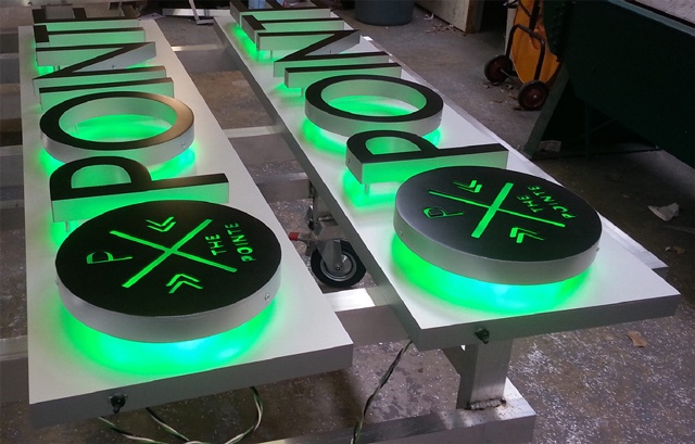 Channel letters are sometimes called dimensional letters, and refer to letters or shapes that have depth. Channels have sides (returns) and a face that’s often illuminated. Or in the case of this example, they can be Reverse Channels, which means the back of the letter is open as opposed to the face. This is also a good example of Halo Illumination, which has a translucent backing that allows the internal LEDs to shine behind the letters onto the supporting surface. In this example we routed design elements into the faces to create both face and halo illuminated channel effects.