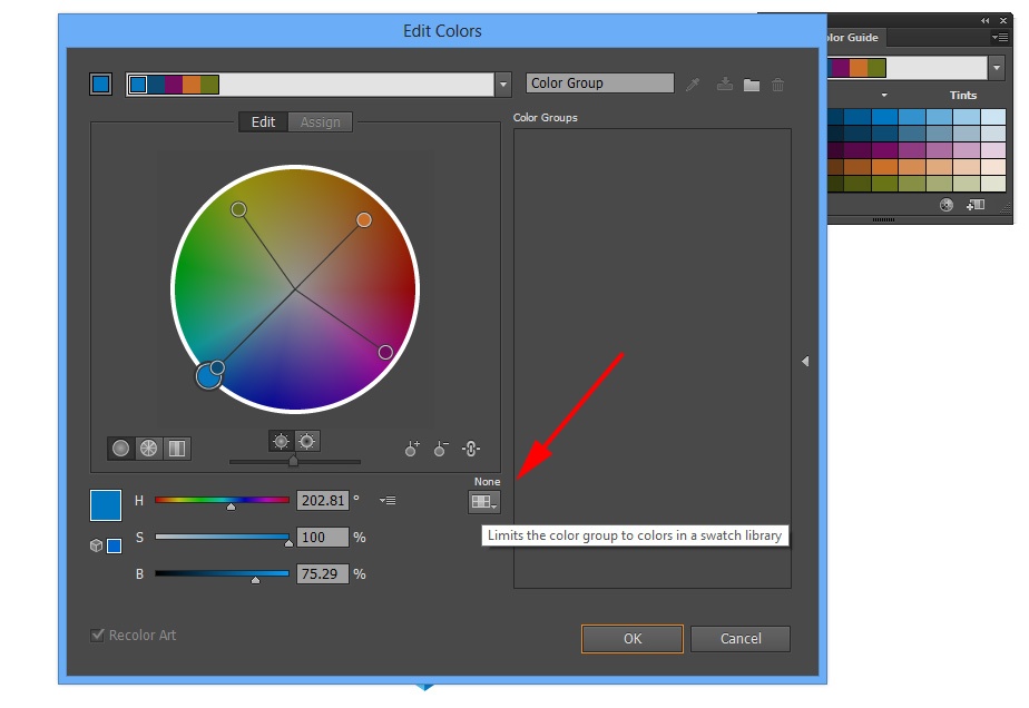 Open the Color Guide Panel. Your color should be selected. Click the drop down arrow just under the x to close the panel, and open up the Color Guide Panel Options. Choose Edit Colors.